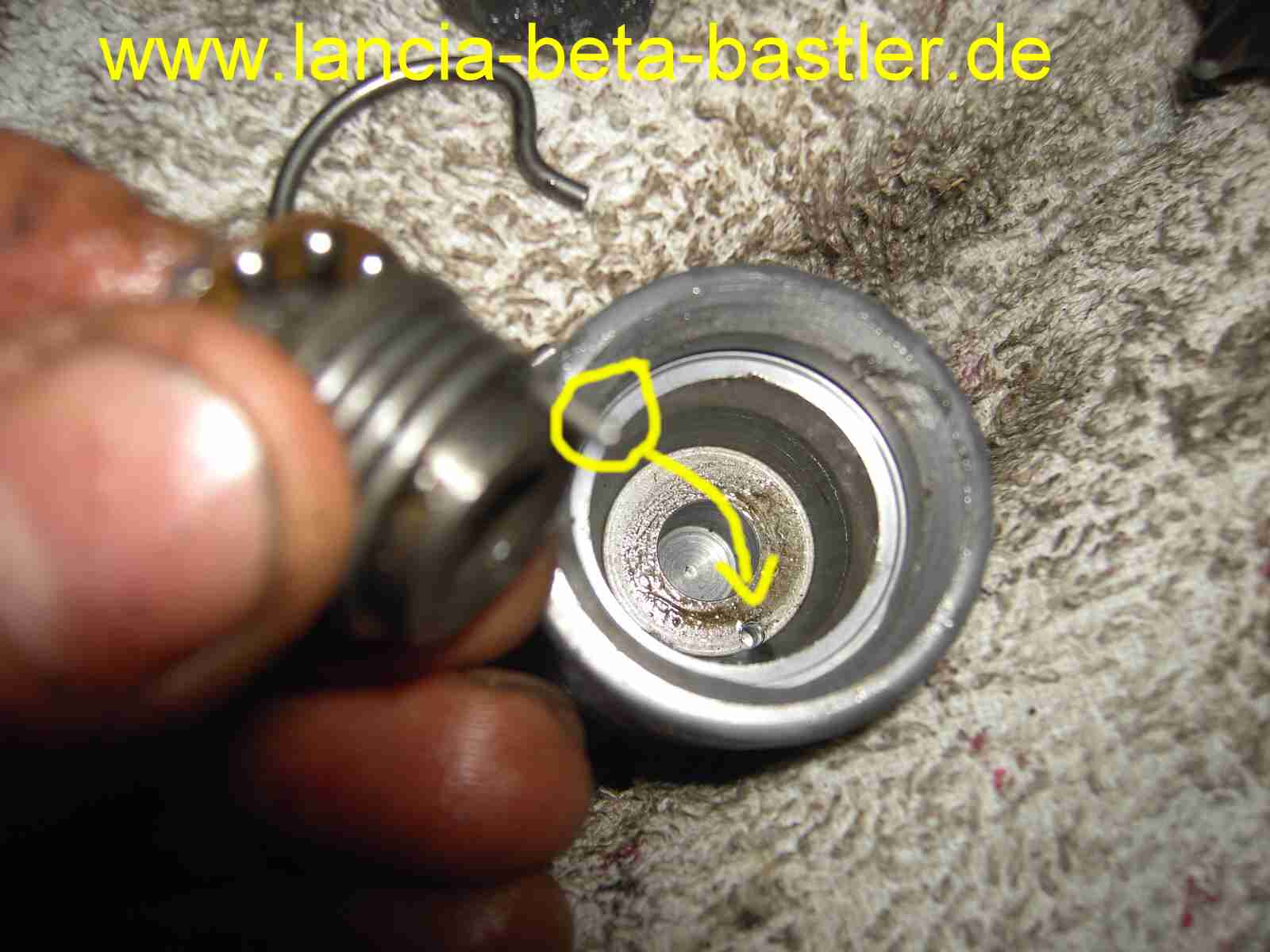 Auf den beiden Bildern ist die Bewegung nicht richtig zu sehen. Es sind auch nur 2-3mm. geschätzt! Sollte es nicht funktionieren, muss alles wieder zerlegt und nach dem Fehler gesucht werden. Ich habe dies vorher an einer alten Bremszange probiert und es bewegte sich nichts. Beim Zerlegen stellte ich fest, das kein Keil eingebaut war. An einer anderen Zange stellte ich fest, das die Nase der Spannfeder im Kolben abgebrochen war. Dadurch war auch keine Bewegung vorhanden. Also, spätestens jetzt bitte testen! Wichtig! Auf dem Kolben befindet sich eine große Nut und eine Kleine. Die Kleine Nut ist eine Markierung für die automatische Rückstellung des Kolbens. Sie muss immer beim Einbau nach oben stehen, also zum Entlüftungsnippel. Spätestens, wenn Ihr die Bremszange am Auto montiert, muss die kleine Nut nach oben zeigen. Diesen Hinweis bekam ich vom Klaus ! Danke. Auf dem Bild ist die Stellung nicht richtig, sollte also um 180° nochmals verdreht werden!