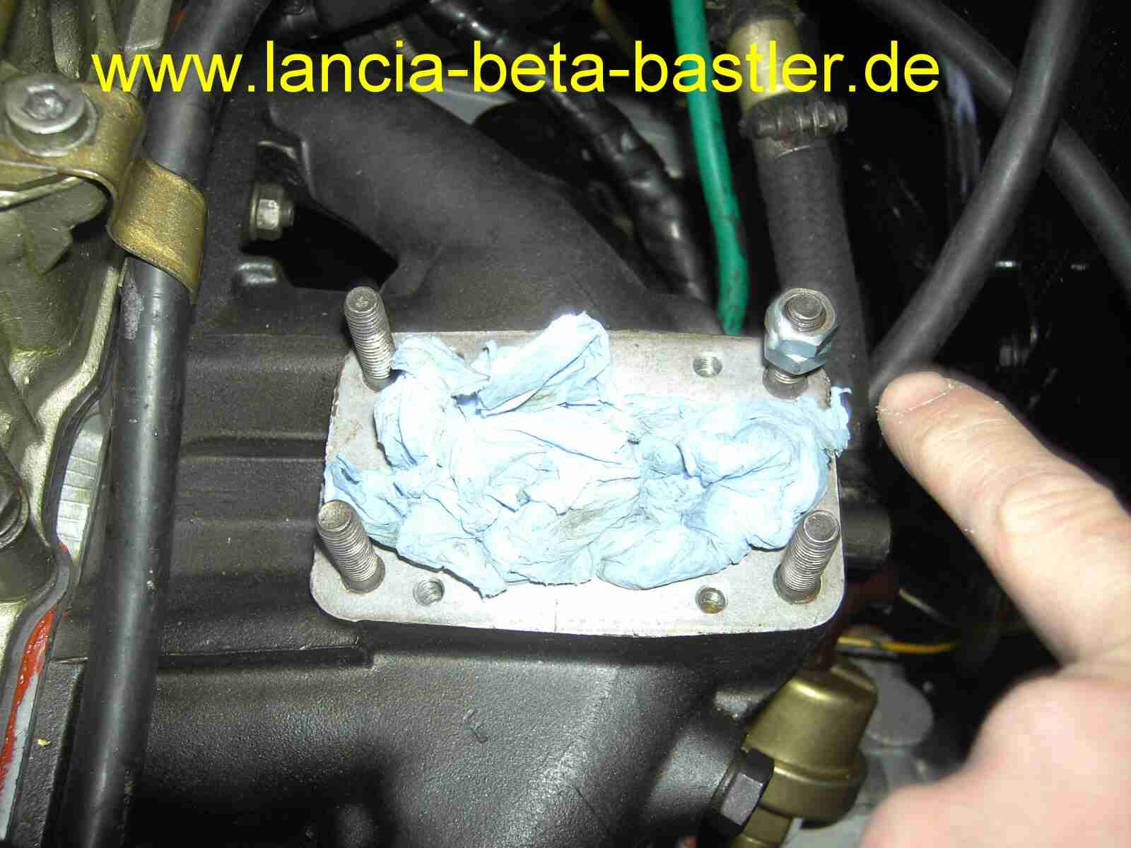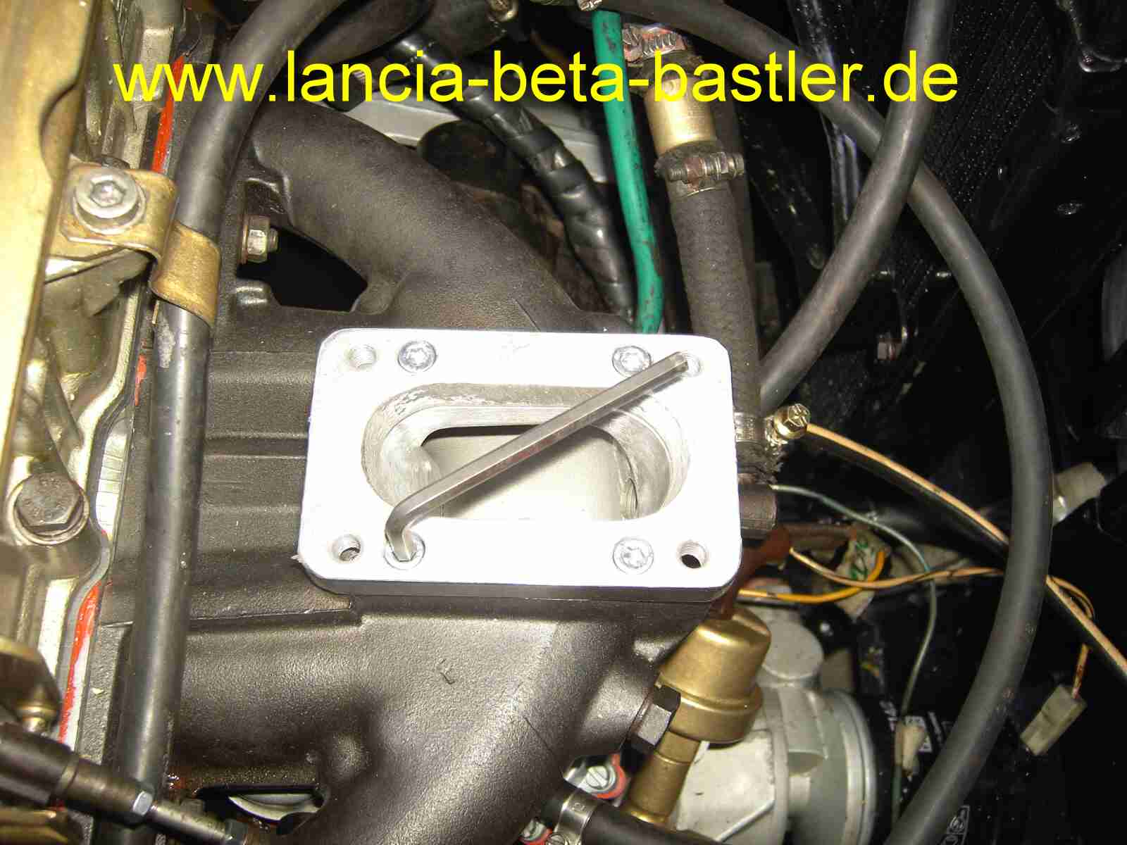 Das ist mein neu aufgebauter Lancia Beta Motor. Beim Aufbauen bohrte ich gleich die neuen Bohrungen für die Adapterplatte in die Ansaugbrücke.
