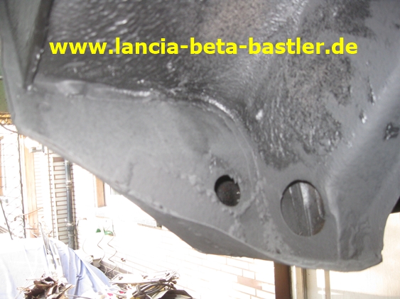 Die behandelten Schadstellen die ich durch Schweißen repariert habe sind mit schwarzen Metallschutzklack vorgrundiert worden.