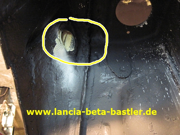 Hier kann man im Radkasten die Löcher zum Zugang der Hohlräume sehen. Mit der Sonde sprühe ich das gute Farbkriechöl hinein.
