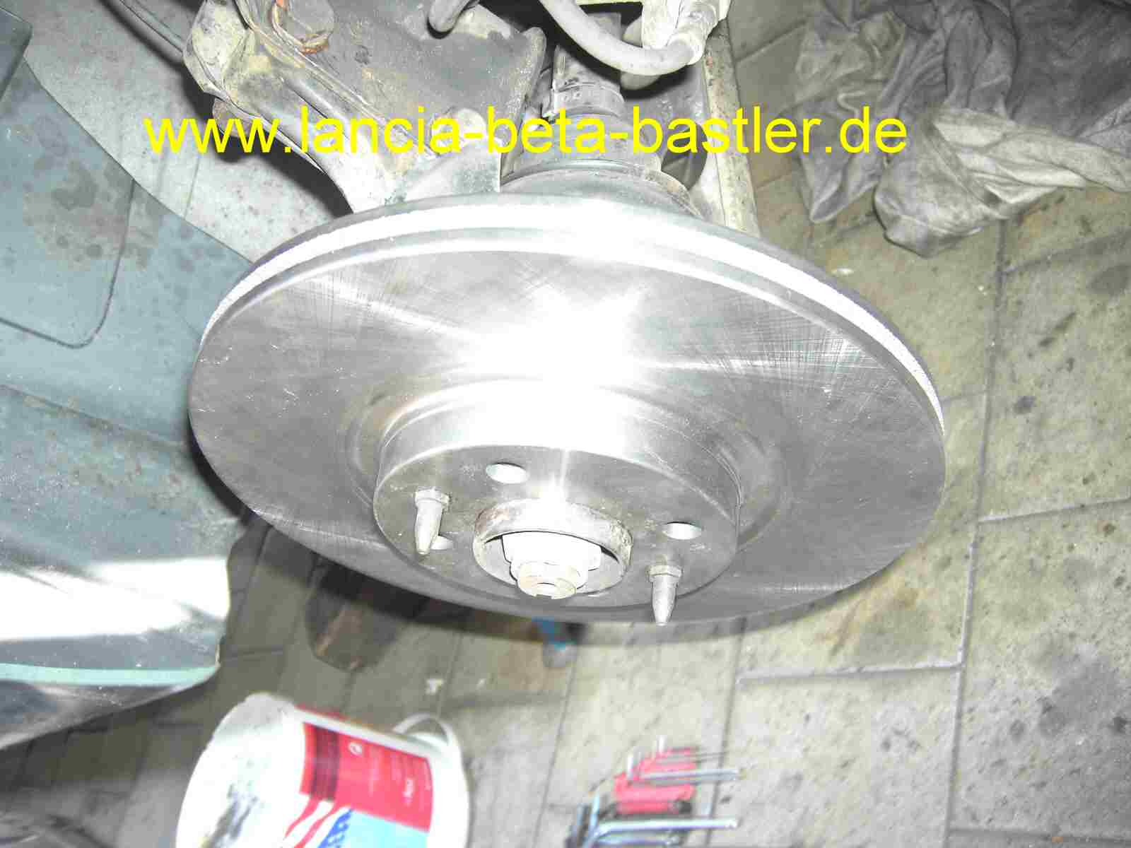 Und wenn ich schon Alles zerlegt ist, dann kann ich auch gleich neue Bremsscheiben und Beläge montieren. Zentrierschrauben der Bremsscheibe lösen.