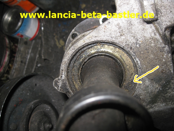 Das ist der eingebaute Lagerbock der Zwischenwelle und auf dieser Seite kann man den Seegering sehen. Diesen werde ich diesmal nicht entfernen!