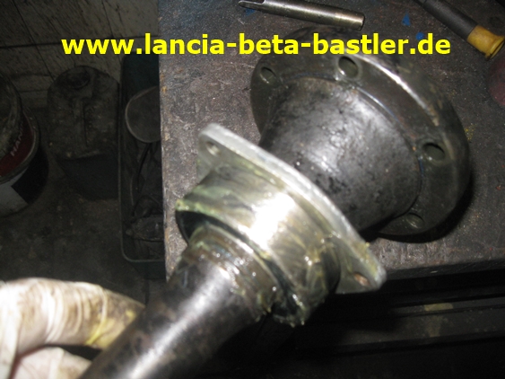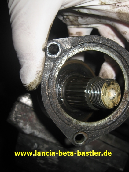 Die Verbindungshülse ist auch mit der Zwischenwelle entfernt worden. Das ist der rechte Antriebszapfen vom Lancia Beta Getriebe. Am Montecarlo ist hier schon ein Flansch für die Antriebswelle vorhanden.