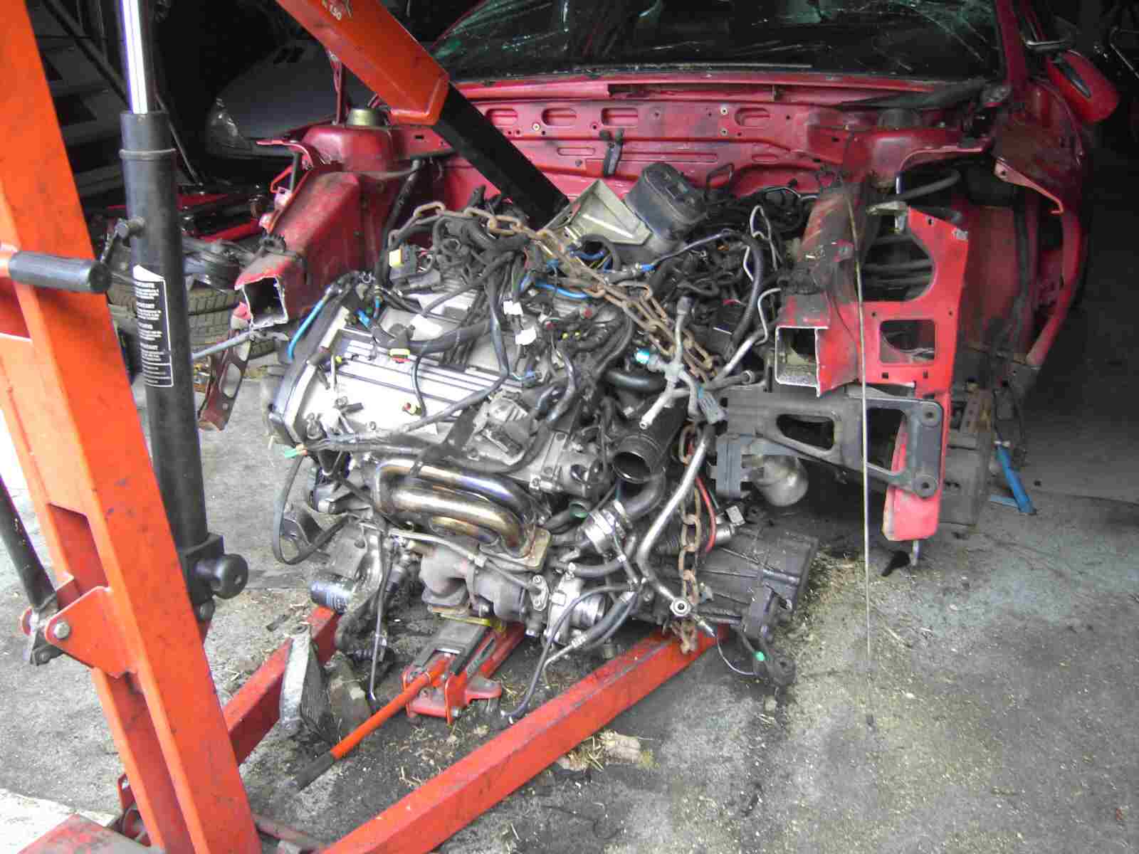So, die Maschine ist ausgebaut und jetzt überlege ich noch, was an diesem Wrack noch zu gebrauchen ist! Ich nehme zumindest mal die vorderen Radaufhängungen mit der Bremsanlage mit. Dann noch das Schaltgestänge mit den Zügen, Auspuffteile, Rücklichter, die geile Tankklappe und die 16” Felgen mit. Irgendwann ist aber Schluss!