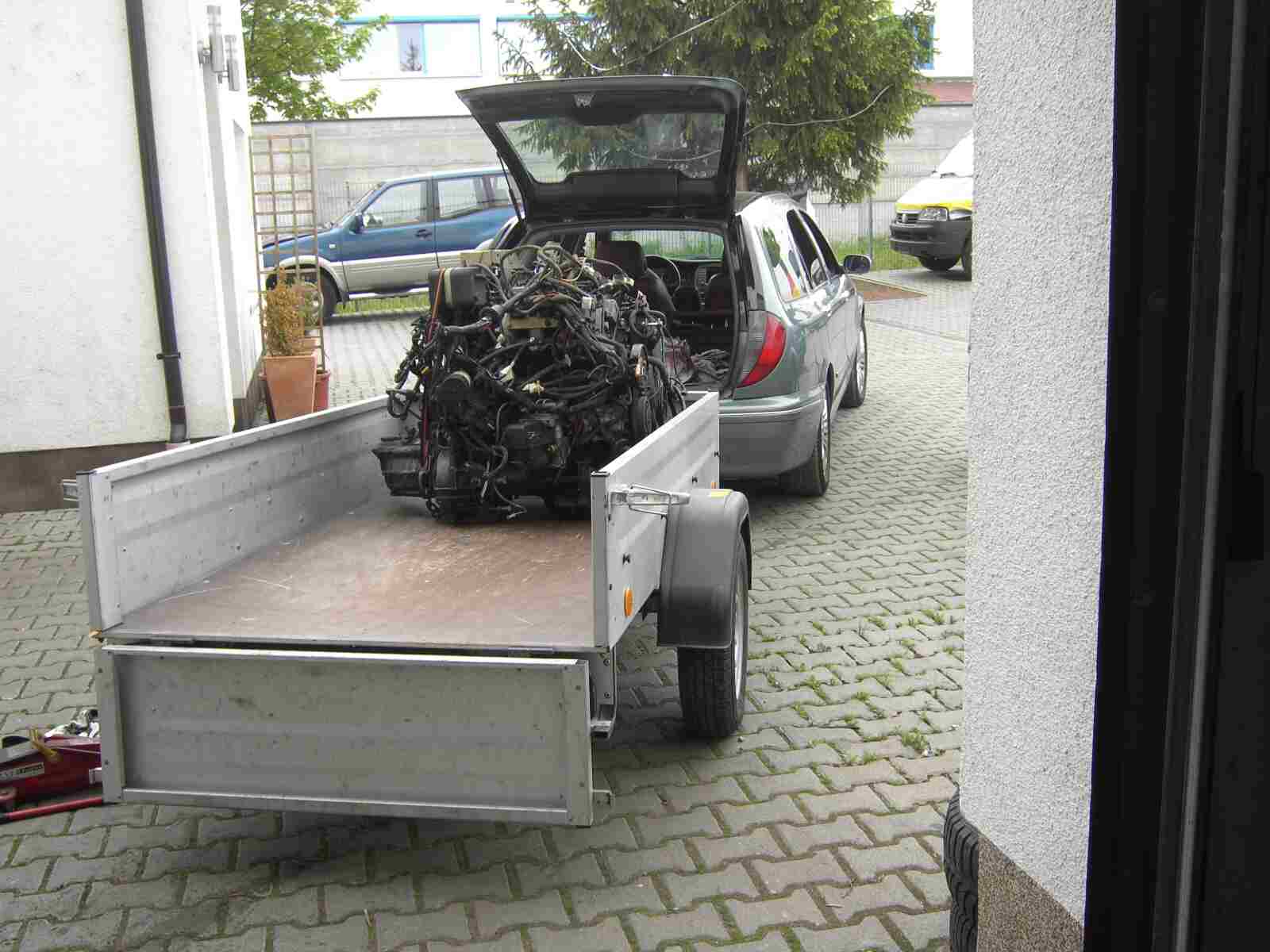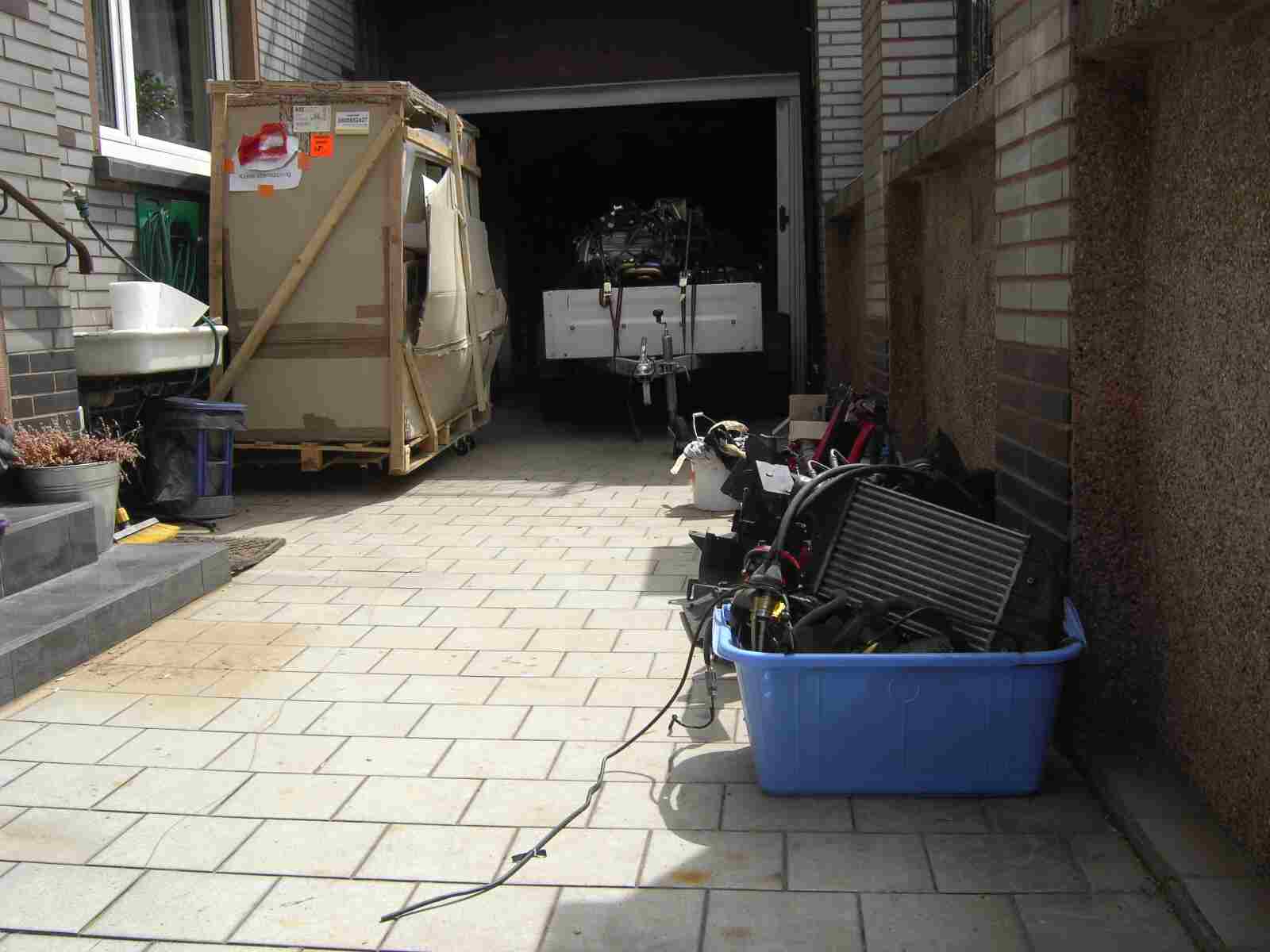 So, wie Ihr auf den Hänger sehen könnt, habe ich natürlich nicht nur die Maschine mit genommen, sondern auch die 16” Alufelgen, Kühler, Radaufhängungen, Bremsanlage und noch so ein paar interssante Ersatzteile! War alles im Preis inbegriffen, da mußte ich einfach zulangen!