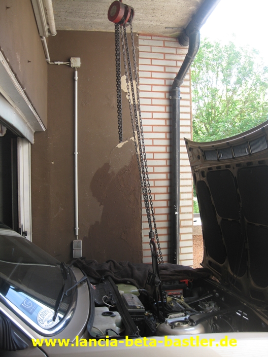 Und jetzt kann ich mit dem Kettenzug den Motor noch etwas anheben.