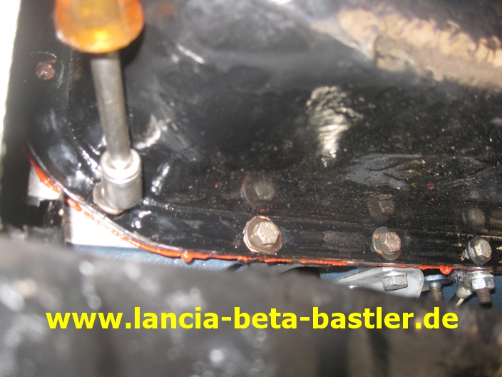 Die Schrauben sind entfernt und die Ölwanne klebt jetzt nur noch mit der Dichtung fest.