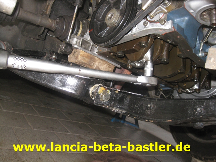 So, weiter läßt sich die Ölwanne nicht absenken. Sie liegt wieder auf der Strebe vom Fahrschemel auf. Ich benötige noch mehr Platz!