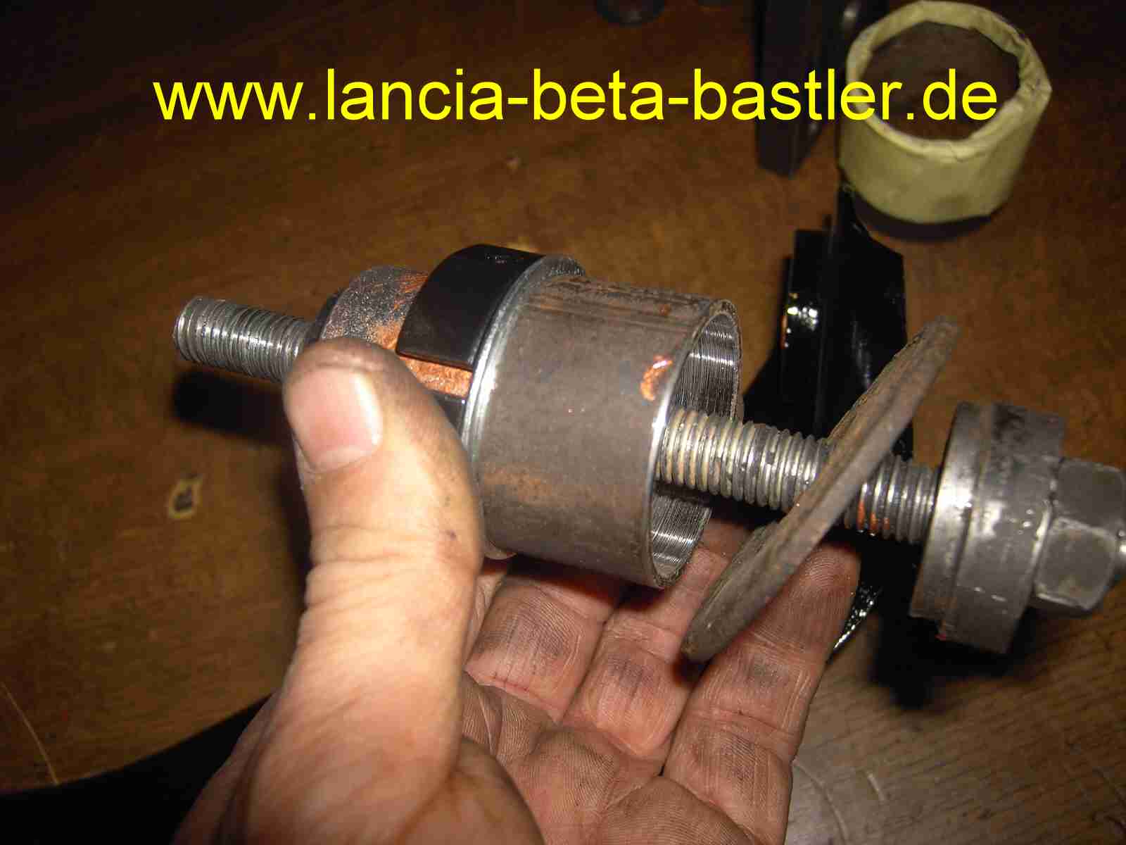 Auf das Rohr montiere ich ein Flacheisen und mit den zwei Muttern auf der Gewindestange versuche ich durch Anziehen die Querlenkerbuchse vom Träger zu lösen. Es funktioniert so aber nicht! Das Gummi wird gequetscht, aber die Buchse löst sich nicht!