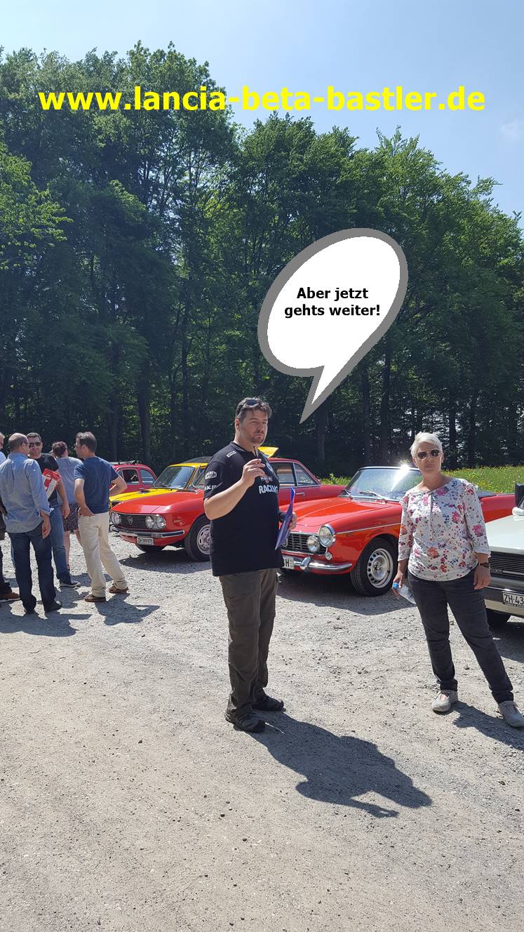 Und nun begrüßt uns der Meister des Treffens persönlich und erklärt, wie die Ausfahrt rund um den Seeruggen geplant ist. Im Hintergrund sein schöner Lancia Beta Spider!