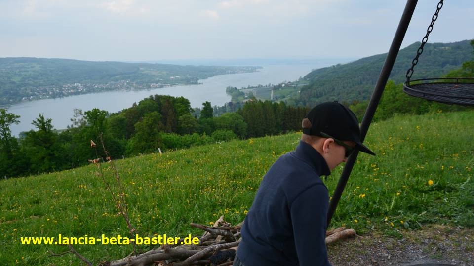 Auch dieser kleine Kerl, es ist der Sohn vom schwarzen Fiat 127 Abarth Fahrers hat Freude am Grillen und an den schönen Autos. Auf dem rechten Bild, hinter dem Jungen, könnt Ihr noch die schöne Aussicht auf den See sehen.