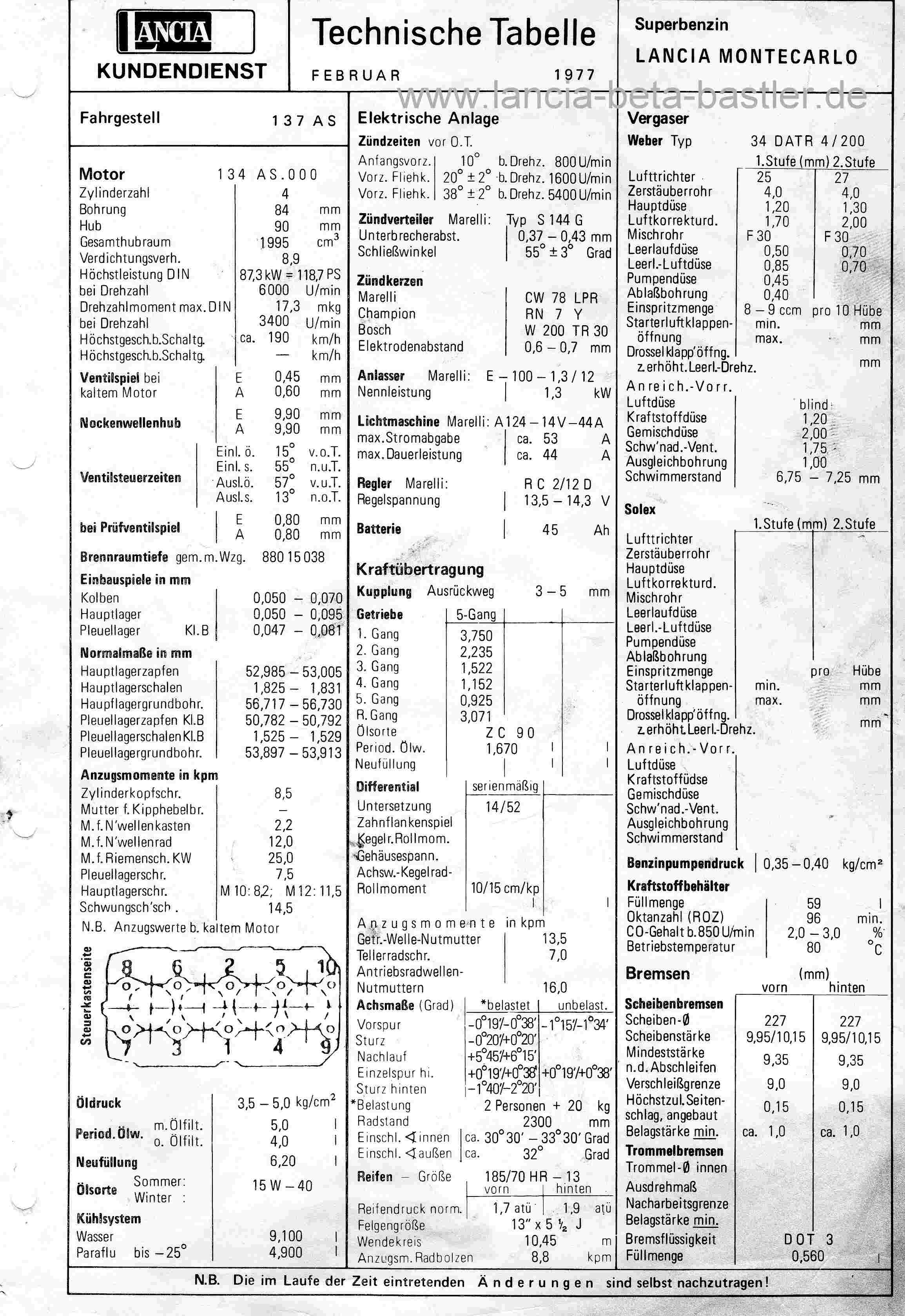 Ich habe schon öfters die Anzugsmomente und die Einstellwerte in Papierform suchen müssen. Auch wurde ich im Urlaub von Lancia Beta Fans nach Werten gefragt, die ich natürlich nicht dabei hatte. Deshalb zeige ich Euch in dieser Rubrik die Daten und Einstellwerte von unseren Lancia Betas und Montecarlos. Wenn Ihr solche technischen Tabellen auch von anderen Fiat und Lancia Fahrzeugen besitzt, dann schickt mir sie bitte doch auch zum Veröffentlichen.