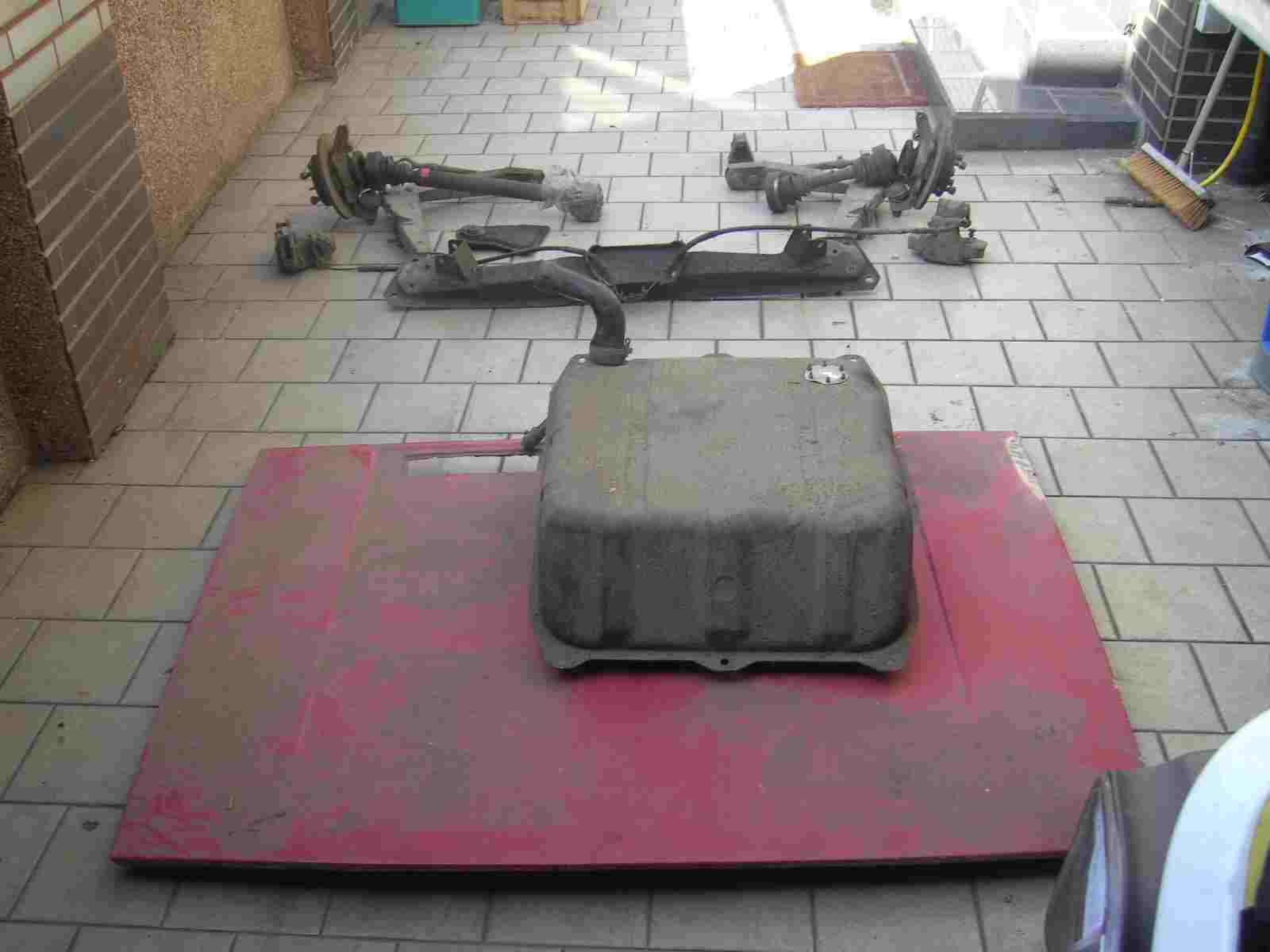 Hier zeige ich Euch erstmal das Grundprinzip. Die Motor- und Getriebehalterungen werden wieder benutzt, aber in abgeänderter Version und der Tank mit dem Einfüllstutzen wird nach vorne gesetzt. Weil für diesen Umbau viele originale Montecarlo Teile abgeändert werden müssen, nehme ich von allen Teile, die Schlechtesten. Außerdem reinige ich die Teile und die Karosserie während des Umbaues nicht, d.h. ich will das Auto erstmal so dreckig, wie es ist, mit den Umbaumaßnahmen zum Laufen bringen und dann wird alles wieder zerlegt, gereinigt, restauriert und lackiert. Ein Grund ist auch die lange Suche nach den richtigen Teilen, aus meinem chaotischen Ersatzteillager.