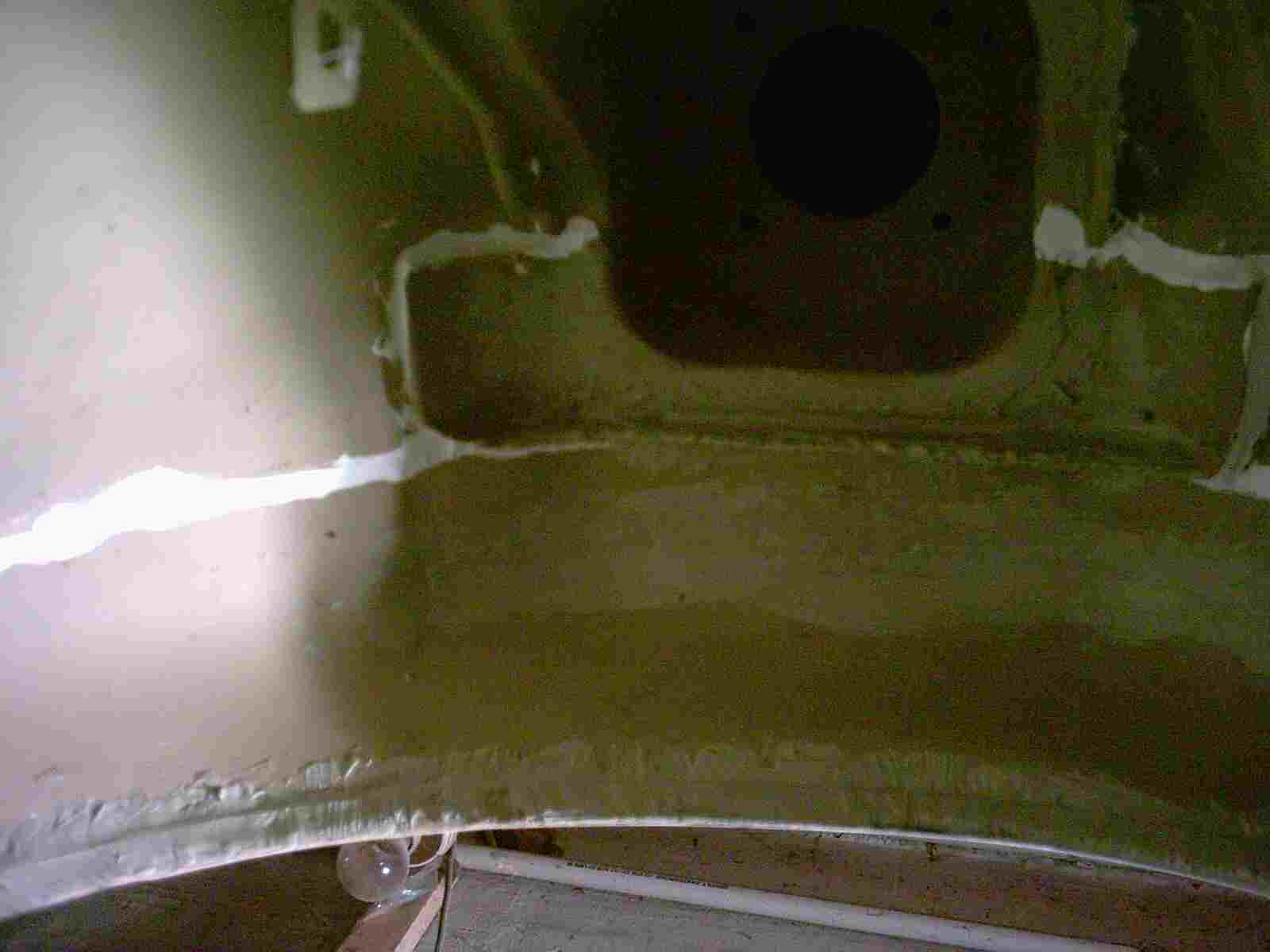 Hier kann man schön den umgelegten Radlauf sehen. Dieser wurde auch grundiert und mit Dichtmasse versiegelt.