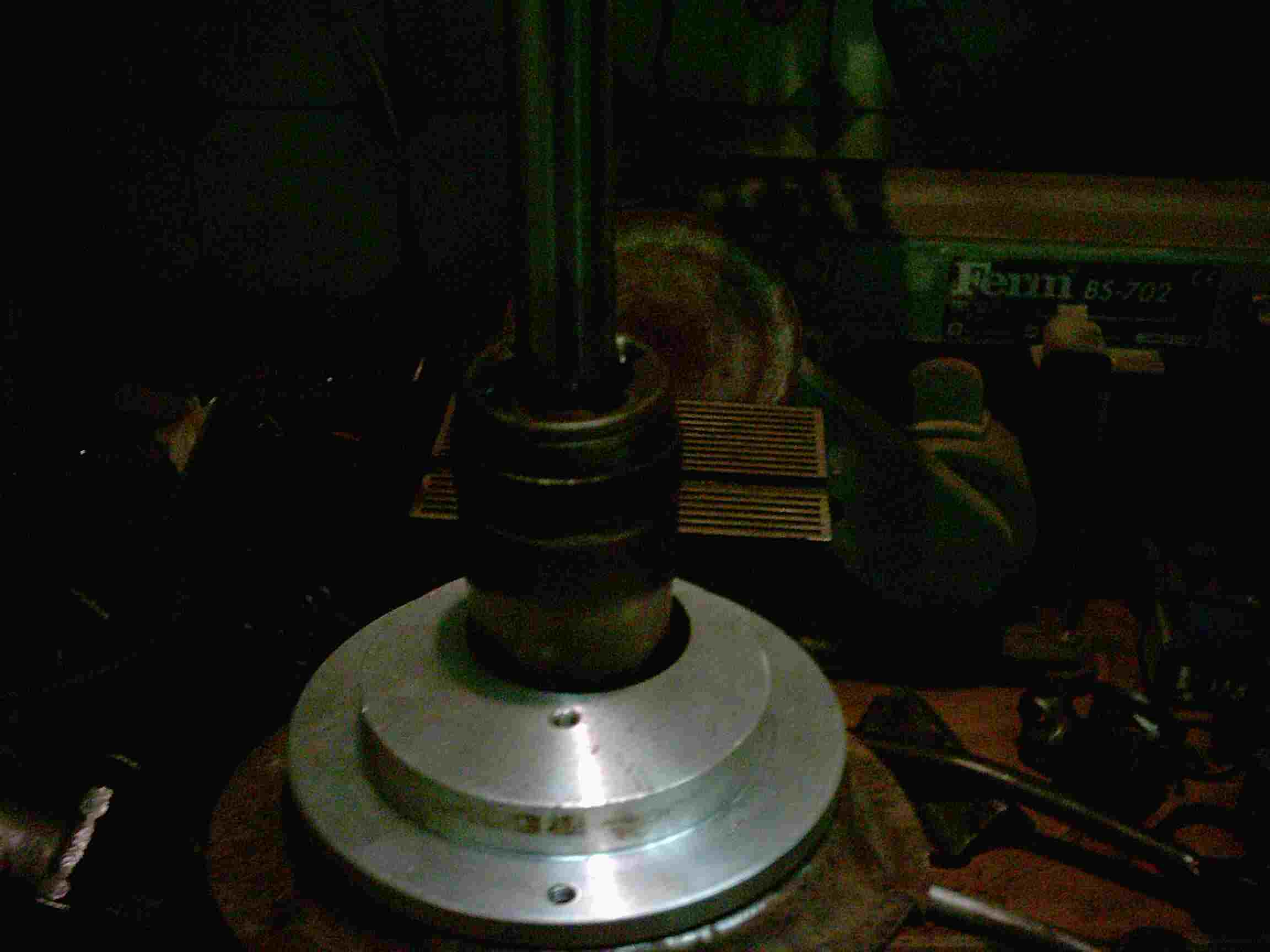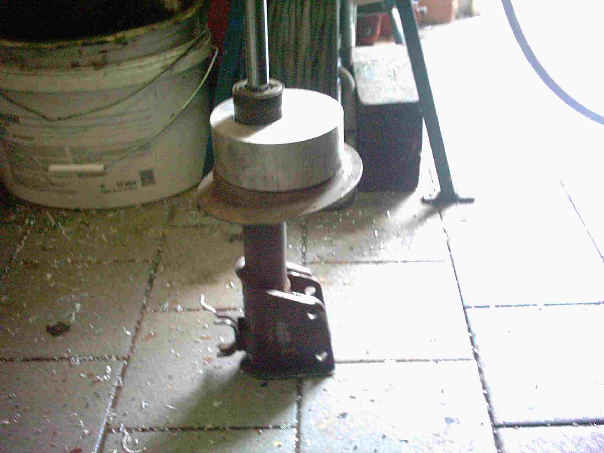 Das Loch des oberen Aufnahmetellers habe ich so vergrößert, dass die Kolbenstange durch geht. Dadurch schlüpft die Stange durch den Teller und schaut nach dem Kürzen der Feder (1 Windung abgeschnitten) etwa 60 mm raus. Dadurch habe ich erstmal das Spiel zwischen Feder und Teller beseitigt, aber zwischen Anzugsmutter und Teller sind immer noch 60 mm Luft vorhanden. Also Drehmaschine angeschmissen und eine Hülse gedreht, die auf der einen Seite ein 60 mm tiefes Loch und den Durchmesser der Stange besitzt. Auf der anderen Seite befindet sich ein kleineres Loch, durch dieses nur das Gewinde der Kolbenstange durch ragt. Auf die Hülse schraube ich dann das Sicherungsblech und die Mutter, so hat der hintere Stossdämpfer auch wieder, nach dem Kürzen der Feder, eine gute Vorspannung.