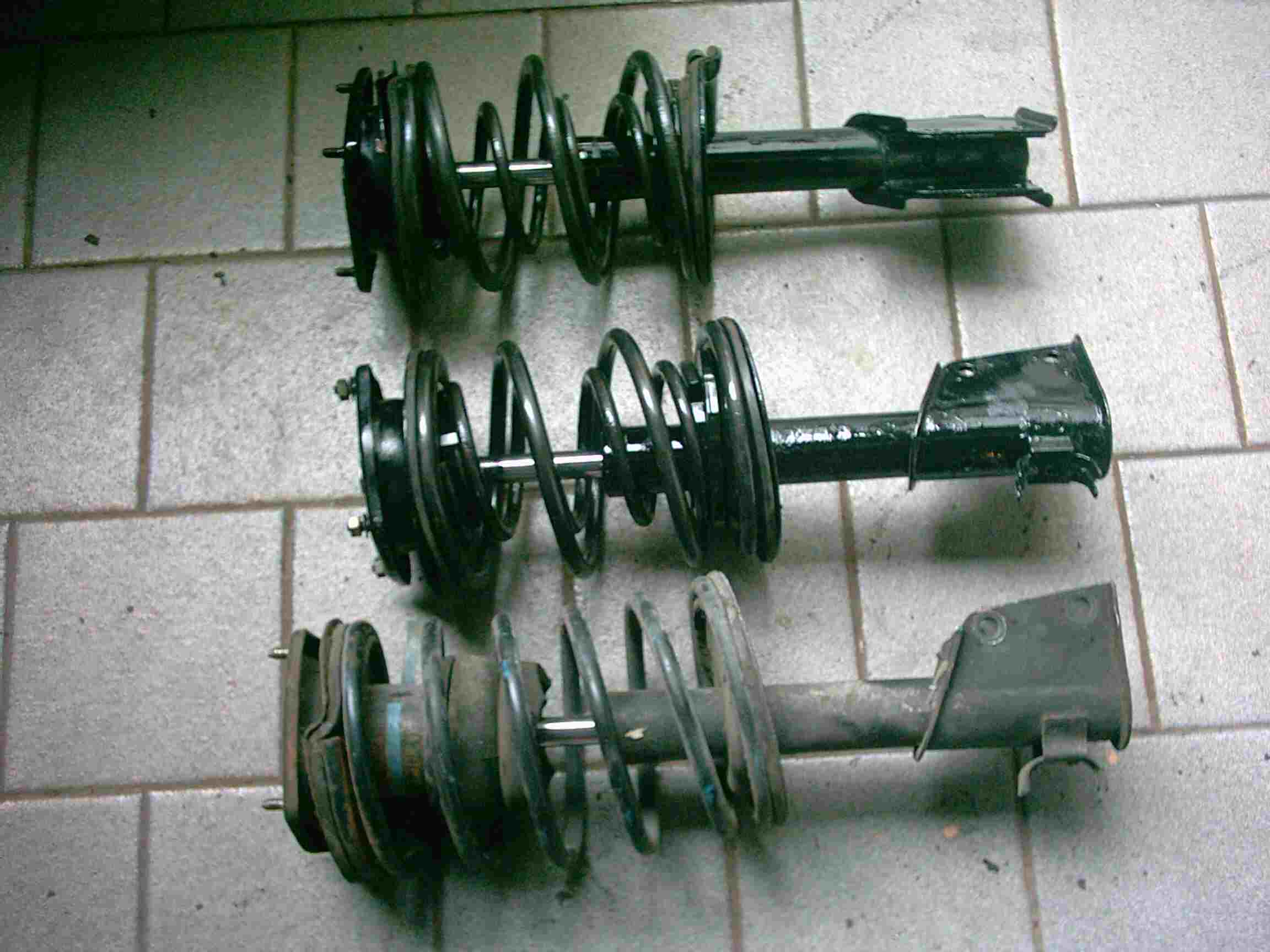Hier noch einmal zum Vergleich. Ganz rechts das originale Federbein, dann die ersten Versuche der Doppelfederung und links das Endergebnis.