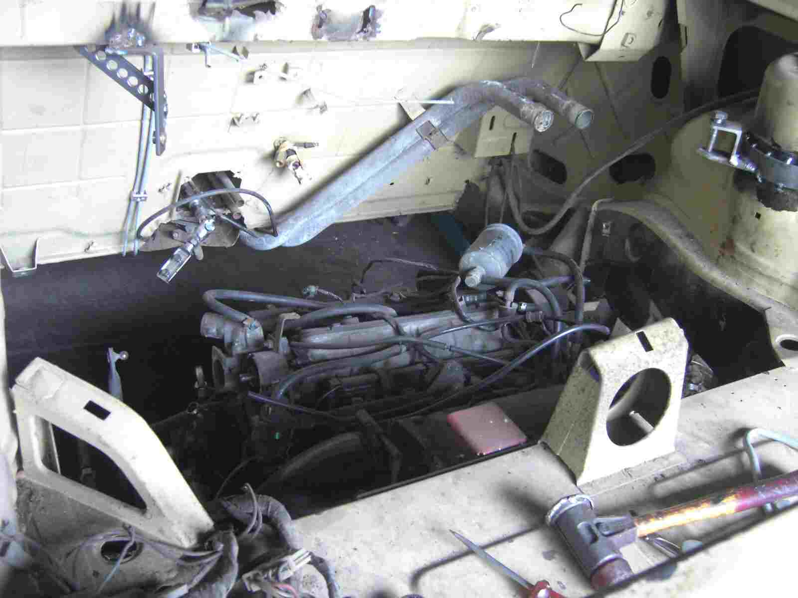 Nur noch die selbst gebaute Motortraverse von der Karosserie geschraubt und ruck zuck liegt der Motor auf dem Wägelchen.