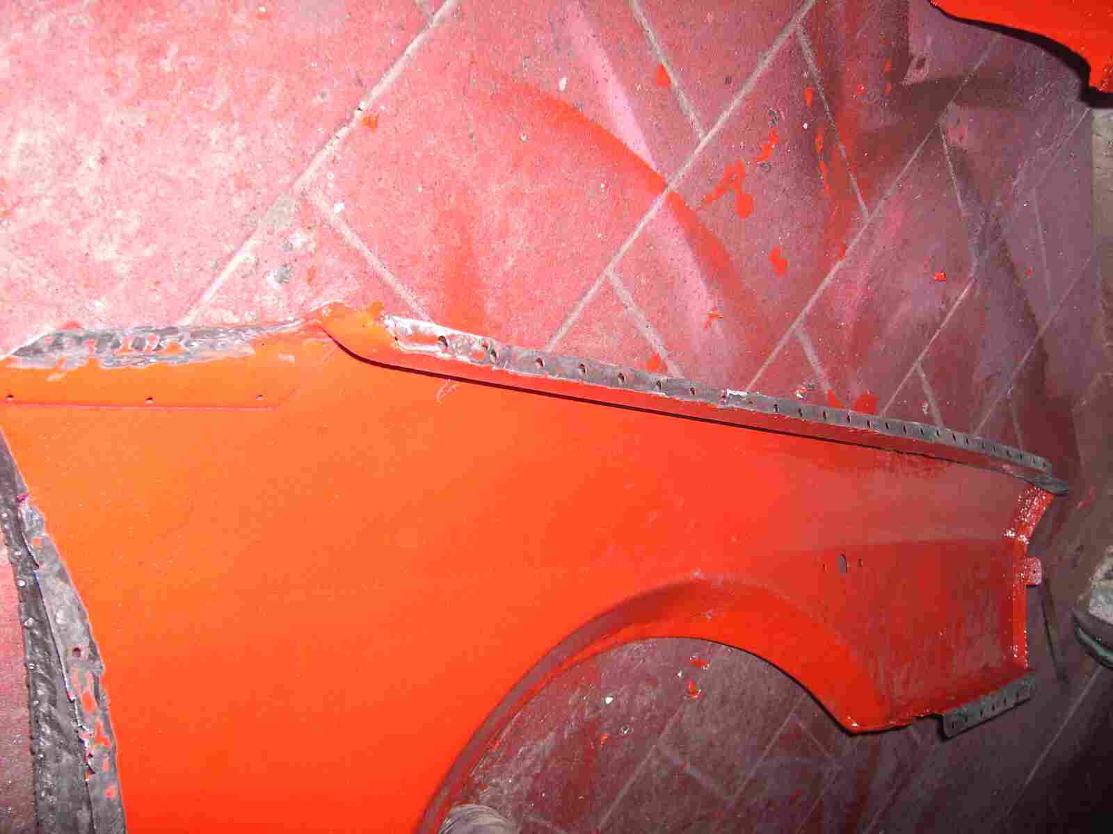 Ich streiche die blanken Stellen gut mit Schweissprimer ein, so sind die Stellen erst einmal geschützt vor Rostbefall und anschweissen kann ich den Kotflügel auch, obwohl der Rostprimer drauf ist.
