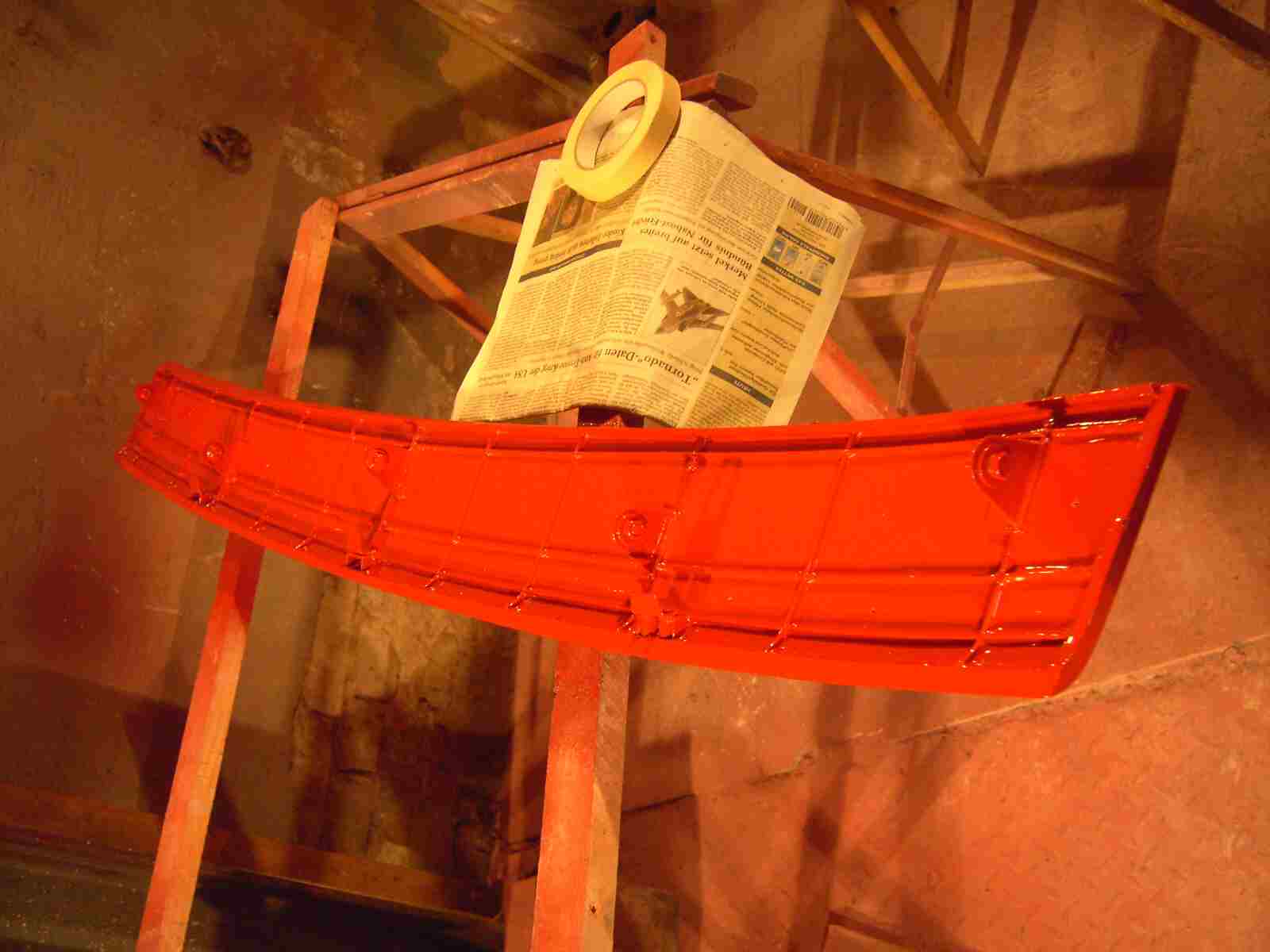 Und siehe da, auch hier harmoniert die Grundierung nicht mit dem alten Lack.,genau so, wie vorher bei den Türen. Das heißt für mich, sauber herunterschleifen und es wieder mit dem roten Endlack probieren. An den Türen hat dies auch funktioniert. Der rote Endlack hat sich dort nicht gehoben.