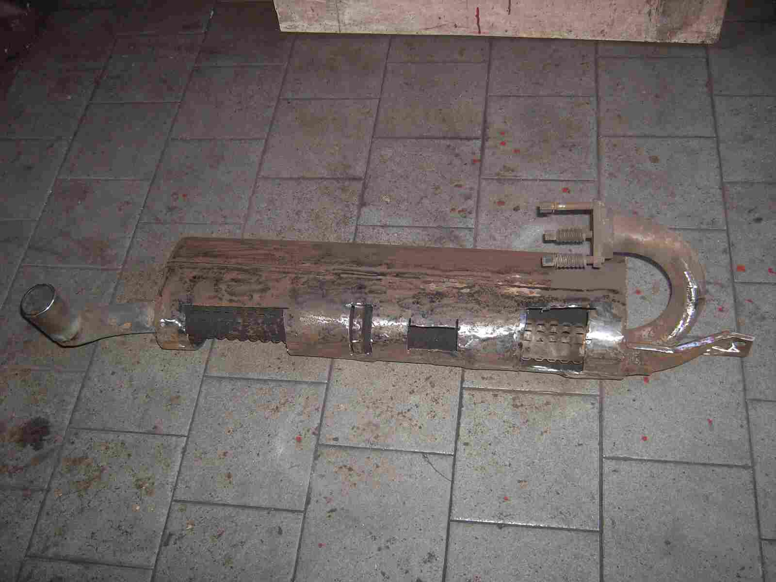 Und das ist mein Auspufftopf, den ich verwenden will. Er ist mit zwei Endrohren bestückt und das ist, glaube ich mal nicht ganz original. Das rechte Rohr sieht nachträglich angeschweisst aus, mal genau hin sehen und überlegen!