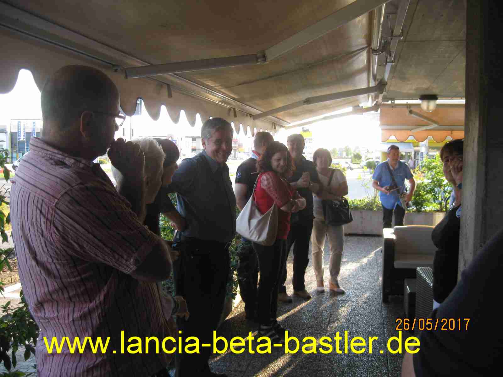 Am Abend tauchen vor dem Hotel ein paar ältere, sympatische Italiener auf. Okay, ihre Frauen haben sie auch mitgebracht und schütteln uns die Hände, naja, geküsst wurden wir auch, ist wohl in Italien so üblich. Sie fingen dann an mit mir zu erzählen, aber ich verstehe kein Wort, aber Davide übersetzt. Er kann mehrere Sprachen, unter anderem italienisch. Also der Mann im grauen Hemd ist Donato und hinten ist Massimo mit seiner Frau Monica. Beide sind fanatische Beta Fans und sind die Gründer des Lancia Beta Museums und des Beta Club Italia. Sie laden uns heute in ihrem Clubhaus zum Essen ein.
