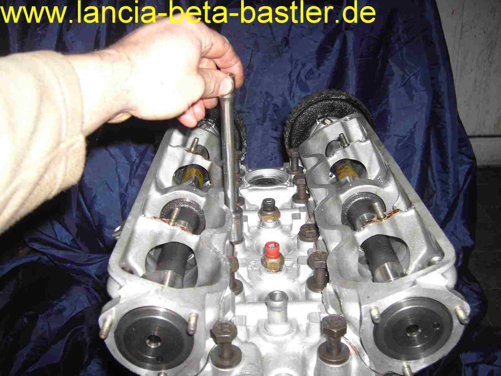 Von der Mitte aus, erst mit 40 Nm und danach mit 85 Nm, ziehe ich den Kopf an. Später, nach der ersten Probefahrt, nochmals im kalten Zustand mit 85 Nm nachziehen. Ist etwas mehr, wie vorgeschrieben, aber so mache ich es, an allen meiner Lancia Beta Motoren, mit Erfolg!